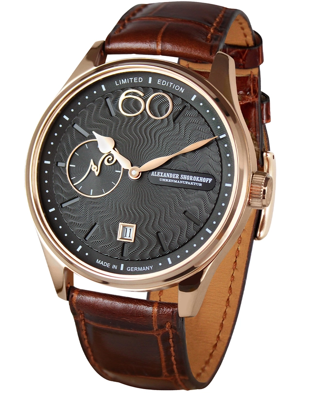 Alexander ShorokhoffEleganz und Mystik strahlt die Neuvorstellung von Alexander Shorokhoff aus, die durch ihre elegante und zeitlose Ästhetik überzeugende „Neva Black“ ist in zwei Farbvariationen erhältlich und kombiniert aufwendige Handgravuren mit dem 3105.Poljot-Handaufzugskaliber. Das 43,5 Millimeter große Edelstahlgehäuse, in das sich eingebettet ein wellenförmig guillochiertes, schwarzes Zifferblatt befindet, ist sowohl mit schwarzer als auch Roségold-farbener IP-Beschichtung erhältlich. Die in Roségold auf neun beziehungsweise in Schwarz auf 30 Exemplare limitierte Edition wird am Kalbs- oder Alligatorlederband getragen und durch einen Glasboden komplettiert, der den Blick auf die Feinmechanik freigibt. Die mit einer Gangreserve von 42 Stunden ausgestattete, 1.799 Euro teure Uhr ist bis 5 Bar Druck wasserdicht.