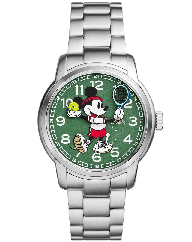 FossilGrund zur Freude besteht für alle Disney-Fans, nachdem Fossil in Kooperation mit dem amerikanischen Medienunternehmen erneut eine Kollaboration veröffentlicht hatte. Die neue, auf die Valentinstagskollektion folgende, limitierte Micky-Mouse-Uhr, die den lustigen und sympathischen Charakter im Tennisoutfit zeigt, begeistert alle Altersgruppen. Wie schon bei historischen Modellen anderer Marken der Fall, werden Stunden und Minuten durch die sich bewegenden Arme der Maus dargestellt, die sich auf einem grün strukturierten Zifferblatt, dem Tennisplatz, befindet. Die auf der Heritage-Serie basierende, auf 836 Exemplare limitierte Edition, besticht zudem durch weitere Details wie einen Sichtboden oder das Micky-Symbol auf der Krone. Ausgestattet mit einem Automatikkaliber, wird die bis 50 Meter wasserdichte Uhr an einem dreigliedrigen Edelstahlband mit Doppelfaltschließe getragen. Für 489 Euro kann das ermunternde Tennisspektakel am eigenen Handgelenk bestaunt werden.