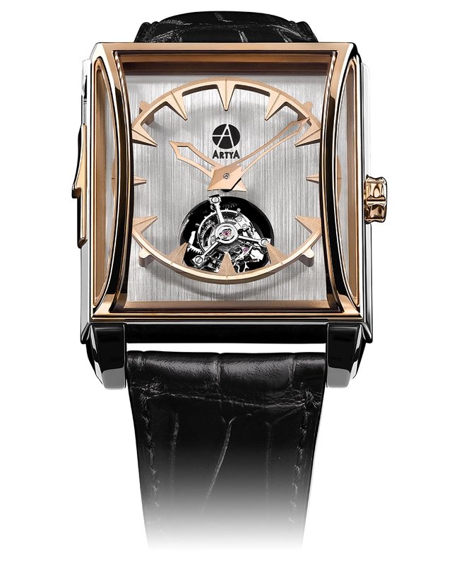 ArtyAAls Olymp der Uhrmacherei kann die Fertigung eines Zeitmessers mit Minutenrepetition beschrieben werden. Neben der ohnehin komplexen wie komplizierten Herstellung eines regulären mechanischen Werks, das höchste Fertigungsqualität verlangt, sind bei der Konzeption dieses Modells noch deutlich höhere Standards einzuhalten. Zusätzlich zur üblichen Feinmechanik müssen Hämmer, Tonfedern und Hebel exakt und hochpräzise gearbeitet sein, um ein harmonisches Glockenspiel mit satten Tönen zu erzeugen. ArtyA erschafft mit seiner Neuvorstellung „Chorus Minute Repeater“, die diese ganz besondere Komplikation aufweist, Haute Horlogerie pur. Die als direkter Nachfolger der 3-Gong-Minutenrepetition mit Regulator und zweiachsigem Tourbillon veröffentlichte Uhr erbt das Gehäuse ihres Vorgängers, übersetzt dieses jedoch durch modernere Formensprache und einen reduzierten Durchmesser geschmackvoll in die Zukunft. Das allseitig mit Saphirglas verkleidete Gehäuse verleiht der geometrischen Gestaltung Eleganz und lässt gepaart mit dem uhrmacherischen Können der Maison Innovation allgegenwärtig und eben vor allem hörbar werden. In das 44,2 mal 44,3 Millimeter große Gehäuse aus Gold ist das hauseigene Manufakturkaliber, das satte 90 Stunden Gangreserve liefert, eingebettet. Komplettiert wird das 377.000 Euro teure Einzelstück durch ein handgefertigtes Lederband.