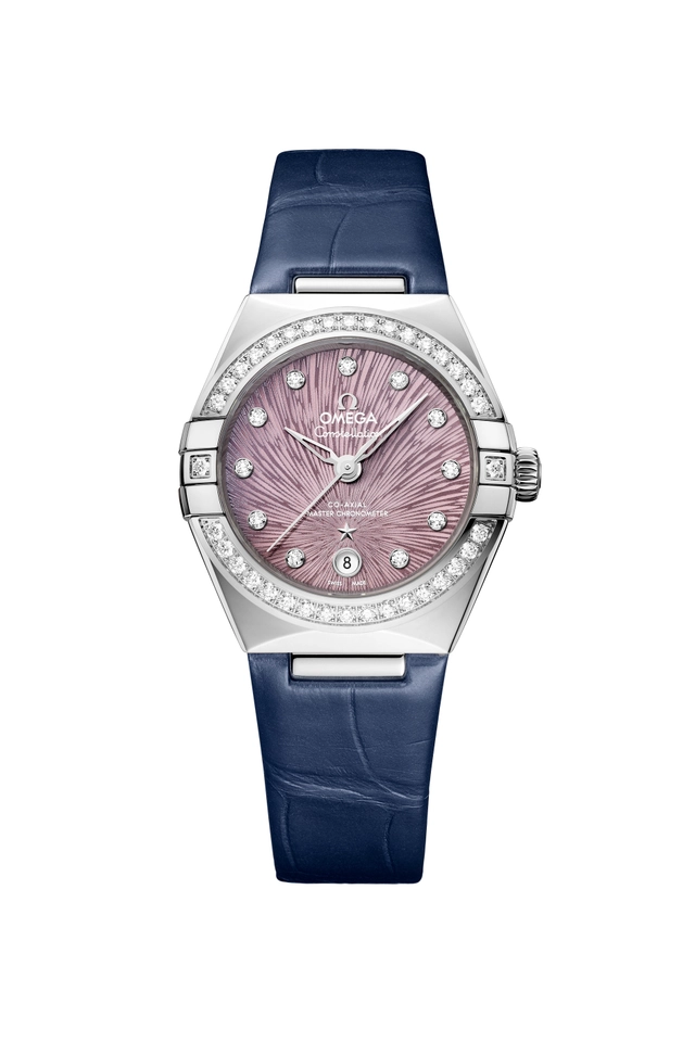 Seit ihrem Debüt im Jahr 1952 symbolisiert die Constellation von Omega das Ideal von Schönheit und Präzision. Die stilprägende Lünette mit den charakteristischen Krappen und Halbmond-Facetten, die nahtlos mit den schlanken Gehäusen verschmelzen, sind seit 1982 das besondere Erkennungszeichen der Kollektion. Die Schweizer Traditionsmanufaktur stellt nun eine neue Modellgeneration für Damen vor, die mit ihren raffinierten Details ein faszinierendes Wechselspiel von Licht und Schatten erzeugt. Das beginnt bei dem auf Hochglanz polierten Gehäuse samt Kranz aus Pavé-Diamanten gefassten Lünette und den elf beziehungsweise zwölf Diamantindexen. Der sprichwörtliche Star ist jedoch das Zifferblatt, das dank eines chemischen Ätzverfahrens ein strahlenförmiges, von einer Supernova inspiriertes Muster aufweist, das vom kleinen Constellation-Stern bei sechs Uhr ausgeht.
