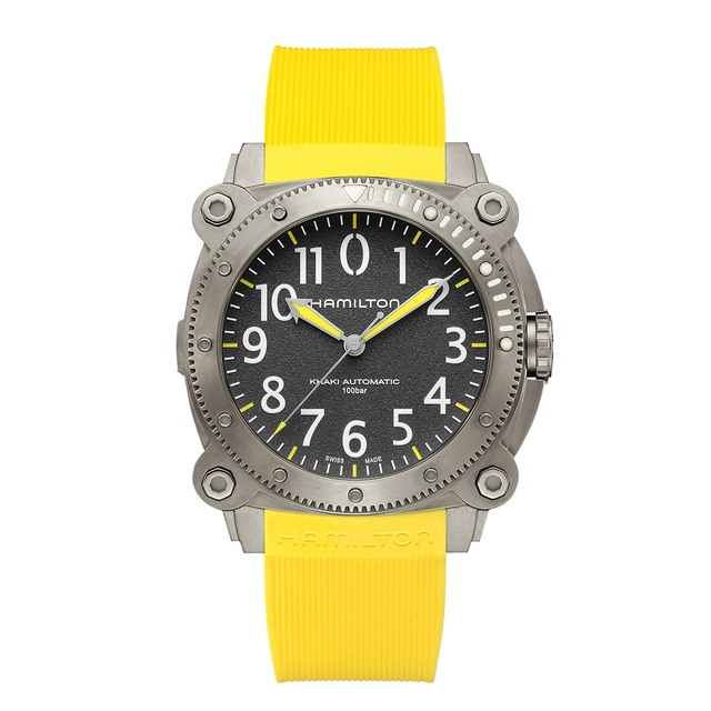 HamiltonEin weiteres Highlight von Hamilton ist die Khaki Navy Belowzero, die nun in einem leuchtenden Gelb erhältlich ist. Die beeindruckende 46 mm-große Khaki Navy Belowzero mit Titangehäuse und schwarzem Zifferblatt bringt frischen Wind in die Kollektion. Dank der kontrastreichen Markierungen und der Sichtbarkeit von Gelb in Küstengewässern, die durch das Splitten des Sonnenlichts in verschiedenen Wellenlängen optimiert wird, ist diese Uhr auch in großen Tiefen gut ablesbar.
