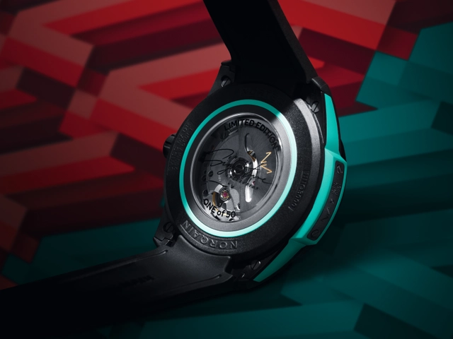 Die Independence Wild One 42 Signature Collection setzt mit einer limitierten Auflage von nur 50 Exemplaren nicht nur auf Exklusivität, sondern auch auf markante Designakzente: Das kräftige Türkis zieht sich über das texturierte Kautschuk-Armband, die Gehäuseflanke bis zu den nachleuchtenden Zeigern und schafft so einen eindrucksvollen Blickfang. Das Zifferblatt besticht auf subtile Weise mit einem lasergravierten, mandala-artigen Relief, das vom Norqain-Logo inspiriert ist. Dieses Designelement symbolisiert das Zusammenspiel von Himmel und Erde und soll die Konzentration fördern. Die applizierten Stundenindexe, die ebenfalls mit Leuchtmasse versehen sind, scheinen darüber zu schweben und erzeugen einen dreidimensionalen Effekt.