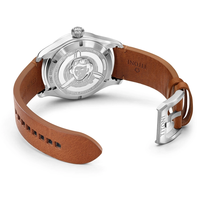 TitoniDie spezielle Politurtechnik verleiht der Uhr eine samtige Haptik, bei der die typische, grobkörnige Struktur von Titan vollständig verschwindet. Ein detailreiches Relief auf dem Gehäuseboden, das einen Piloten aus den 1940er-Jahren und einen Propeller zeigt, betont den historischen Bezug. Der innere Aufbau schützt das Herzstück der Uhr, das Chronometerkaliber Sellita SW200-1, das von einem Weicheisenkäfig umhüllt ist und die Uhr bis zu 500 Gauss vor Magnetfeldern abschirmt.