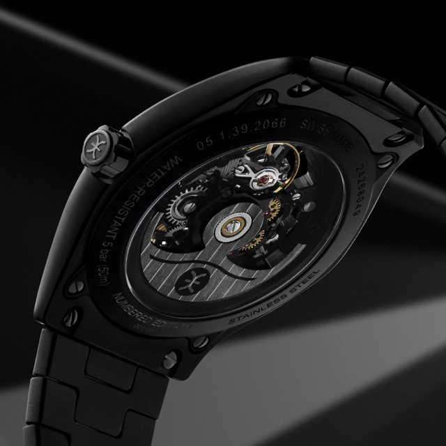 Das Gehäuse der Sport Classic Skeleton misst 42 Millimeter im Durchmesser und 10,25 Millimeter in der Höhe. Es besteht aus Edelstahl, das sowohl gebürstete als auch polierte Oberflächen vereint und mit einer schwarzen DLC-Beschichtung veredelt wurde. Der transparente Saphirglasboden gewährt weitere faszinierende Einblicke in das Innere der Uhr, während das ikonische Wellenarmband aus Edelstahl, ebenfalls mit DLC-Beschichtung versehen, nahtlos ins Gehäuse übergeht und für außergewöhnlichen Tragekomfort sorgt.