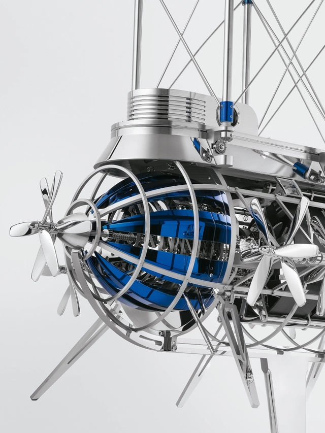 Wenn die Uhr die Stunden schlägt, setzt sich das Flugobjekt in Bewegung und bereitet sich mit seinen 32 rotierenden Propellern, die etwa sieben Sekunden lang wirbeln, auf den Start vor. Im Inneren befinden sich zwei Uhrwerke und zwei Aufzugssysteme: Das eine treibt dank zweier separater Federhäuser die Uhrzeit und den Stundenschlag an, während das andere, von einem dritten Federhaus gespeist, die Energie für die Propeller liefert. Das erste wird von Hand über die Propeller an der Vorderseite der Flugmaschine aufgezogen: im Uhrzeigersinn für den Stundenschlag und gegen den Uhrzeigersinn für die Uhrzeit. Die Propeller auf der Rückseite ziehen den Automaten auf. Die Gangreserve der Uhr beträgt durchschnittlich acht Tage – unabhängig davon, ob das Läutwerk ein- oder ausgeschaltet ist – und die des Automaten.