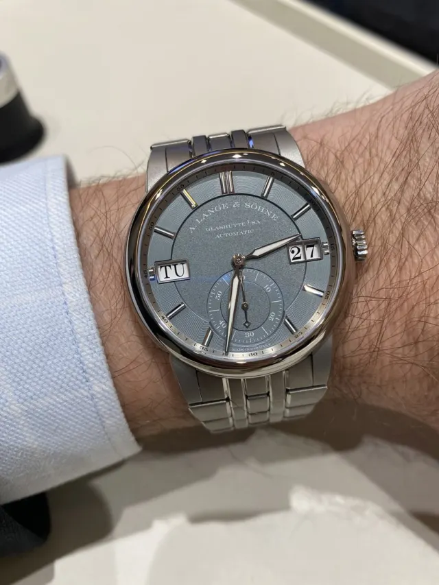 Die A. Lange & Söhne Odysseus in Titan zeigt den Wochentag bei neun Uhr und das Datum bei drei Uhr in zwei getrennten Fenstern