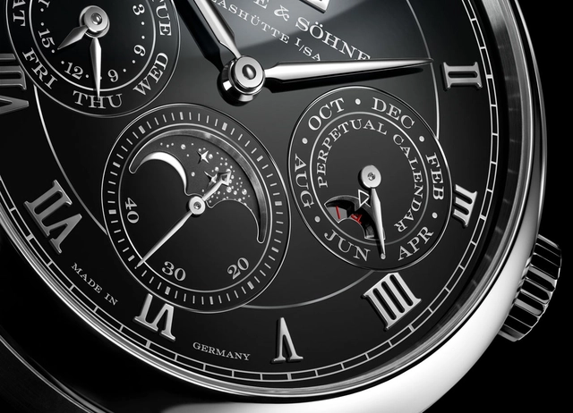 A. Lange & SöhneDie Bezeichnung Datograph steht für einen Flyback-Chronographen mit Lange-Großdatum. Perpetual bezieht sich auf den ewigen Kalender mit sprunghaft weiterschaltenden Anzeigen. Die präzise Mondphasenanzeige muss erst nach 122,6 Jahren um einen Tag korrigiert werden. Und schließlich lässt das Tourbillon mit Sekundenstopp die gangbestimmenden Komponenten Unruh, Anker und Ankerrad einmal in der Minute in einem kleinen Käfig um das feststehende Sekundenrad rotieren – eine ästhetisch und uhrmacherisch höchst anspruchsvolle Konstruktion, umgesetzt im weiterentwickelten Lange-Manufakturkaliber L952.4. mit Handaufzug.
