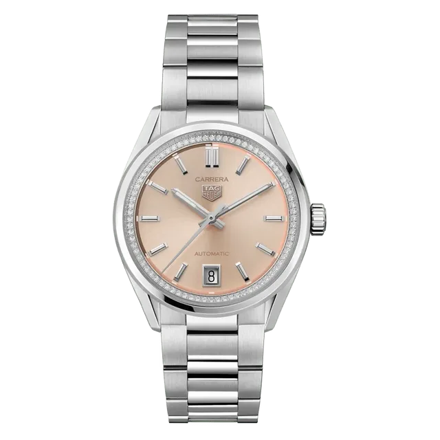 Das dezente, puderrosafarbenen Zifferblatt der 36 mm-großen TAG Heuer Carrera wird von einem mit Diamanten (0,288 ct.) besetzten Zifferblattring umgeben. Das Edelstahlmodell mit Referenz WBN231A.BA0001 wird angetrieben vom Kaliber 7 mit 56 Stunden Gangreserve (Basis ETA 2892) und kostet 4.550 Euro.