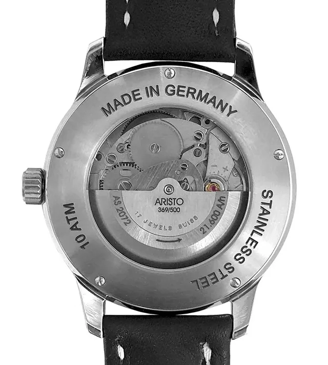 Weitere Informationen zur Aristo AS 2072 erhalten Sie unter www.aristo-uhrenvertrieb.deHansjörg Vollmer, Chef von Aristo, erwarb bereits im November 2002 einen bis dahin unbekannten Lagerbestand alter AS 2072 Automatik-Werke und entwickelte in den Folgejahren eine Uhrenserie Namens AS 2072. Die zur Verwendung kommenden 11 1/2-linigen Uhrwerke arbeiten mit 21.600 Halbschwingungen pro Stunde, was einer Frequenz von 3 Hertz entspricht und sind mit der zuverlässigen Incabloc-Stoßsicherung ausgestattet. Die Gangreserve beträgt 46 Stunden. Die Seriennummer, die Aufzugsrichtung und die Frequenz sind auf dem Rotor eingraviert und durch den Glasboden immer sofort erkennbar.