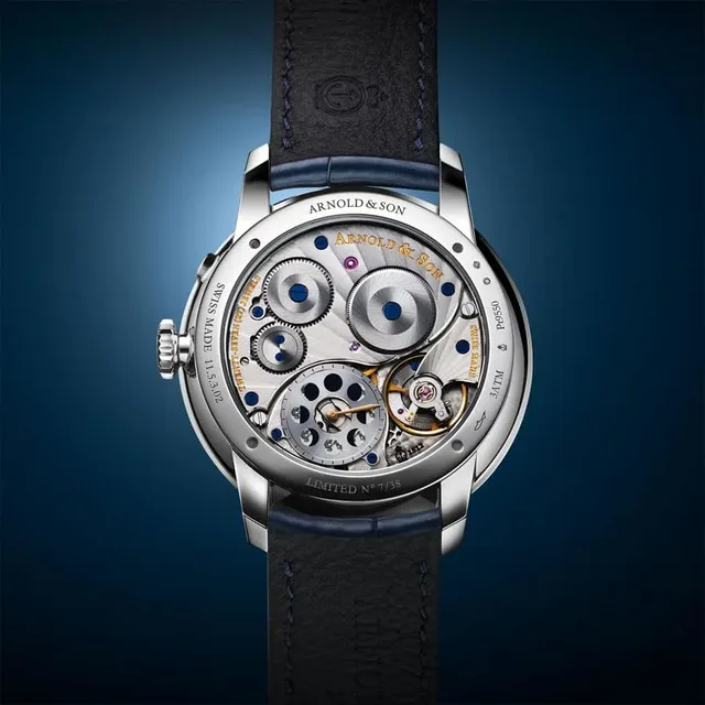 Mindestens genauso sehr wie der Mond fällt die "Stellar Rays" genannte Verzierung auf dem Zifferblatt auf. Bei dieser Gravur sorgen Strahlen mit unterschiedlich breiten und tiefen Strahlen für den besonderen Effekt. Nach einer mittelblauen und einer lachsfarbenen Variante hat Arnold & Son die Neuheit mit einer blassblauen PVD-Beschichtung verschönert. Hinter dem Zifferblatt sorgt das in der eigenen Manufaktur gebaute Kaliber A&S1512 mit Handaufzug und 90 Stunden Gangreserve für Funktionieren und Präzision von Zeit- und Mondphasenanzeige – letztere müsste theoretisch erst nach 122 Jahren ununterbrochener Tätigkeit um einen Tag korrigiert werden. Auf der Rückseite der Uhr sieht man durch den Glasboden das mit verschiedenen Zierschliffen und gebläuten Schrauben finissierte Werk; neben der Unruh befindet sich zudem eine zweite, übersichtlichere Mondphasenanzeige, die zur schnellen Einstellung der Hauptanzeige dient. Umschlossen wird das Innere von einem 11,3 mm hohen Platingehäuse mit 41,5 mm Durchmesser, das bis 30 m wasserdicht ist. Insgesamt fertigt Arnold & Son 38 Exemplare dieser limitierten Uhr, die für 46.600 Schweizer Franken (inkl. MWSt.) verkauft wird. buc