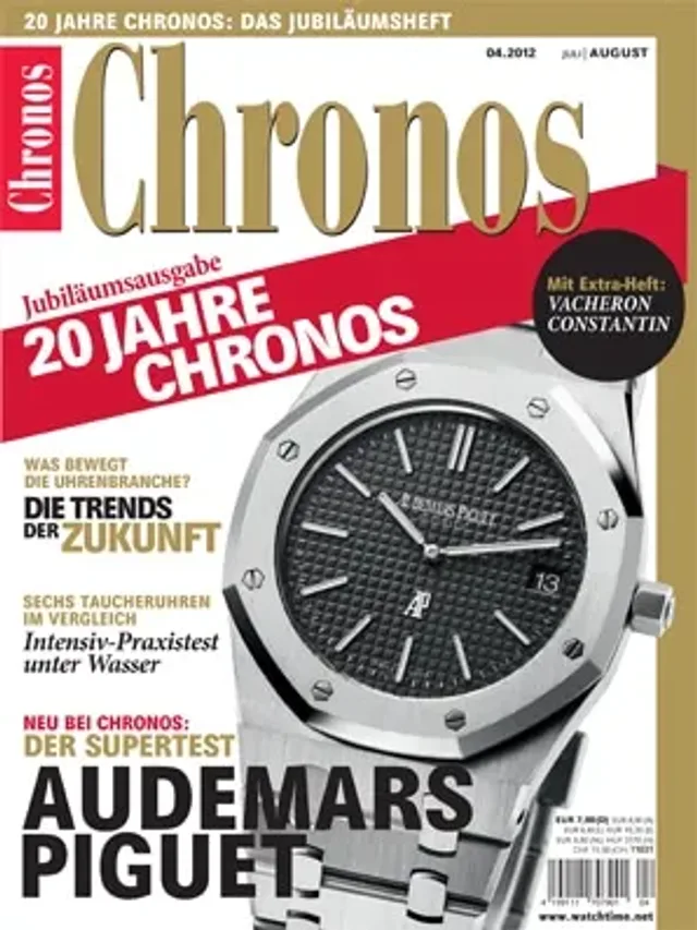 In einem Jubiläumsheft will man natürlich etwas Besonderes bieten. Wir wollten aber diesmal den Blick nicht in die Vergangenheit richten, sondern in die Zukunft. Also nicht: „Die besten Uhren der letzten 20 Jahre“ oder: „Die besten Geschichten aus 20 Jahren Chronos“, sondern: „Wie sieht die Uhrenwelt in fünf oder zehn Jahren aus?“. Dafür haben wir uns überlegt, was derzeit wichtige Themen in der Uhrenbranche sind. Themen, die so wichtig sind, dass sie auch die nächsten Jahre prägen werden. Dabei geht es nicht nur um Trends im engeren Sinn, wie Formen oder Farben, sondern auch um Technik, Materialien, aber auch um Themen von Vertrieb und Marketing.Darüber starten wir in der Jubiläumsausgabe zwei neue Testarten. Zum einen den Supertest. Supertest heißt, dass wir die gesamte Uhr, auch das Werk, komplett zerlegen. Dabei nehmen wir Konstruktion und Dekoration unter die Lupe. Die erste Uhr im Supertest ist die extraflache Jubiläums-Royal-Oak von Audemars Piguet mit dem bekannten Automatikkaliber 2121.Außerdem in Chronos 04.2012: der erste Praxisuhren-Tauchtest. Dazu haben wir sechs Taucheruhren aus verschiedenen Preisbereichen mit ins Wasser genommen. Neben dem Chronos-üblichen Testergebnis mit dem für alle Testuhren gültigen Punkteschema bekommt jede Uhr eine extra Tauchwertung, in der wir sagen, wie gut sie sich im Praxiseinsatz unter Wasser bewährt.Aber natürlich gibt es noch viele andere interessante Artikel. Mehr wird nicht verraten -- wer mehr wissen will, muss schon selbst ins Heft schauen. Erhältlich ist es ab 13. Juli im Zeitschriftenhandel und parallel dazu (auch vorher schon) über unseren Online-Shop.Übrigens: Unser Autor Alexander Linz stellt auf seinem Blog watch-insider.com ebenfalls unsere Jubiläumsausgabe vor. Zu hören gibt es dort auch ein kurzes Interview, das er am 10. Juli mit mir in La Chaux-de-Fonds geführt hat. buc