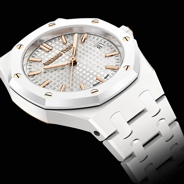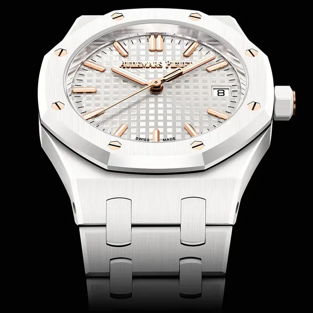 Die neue Version ist in reinem Weiß gehalten und setzt mit Roségold-Details Akzente – an Schrauben, Zeigern und Stunden-Indexen sowie am Gehäuseboden und auf der Schwungmasse. Die acht eigens aus 18 Karat Roségold gefertigten hexagonalen Schrauben fixieren die Lünette sicher auf dem Gehäuse und rahmen das versilberte Zifferblatt ein. Das Zifferblatt greift das zum 50-jährigen Jubiläum der Royal Oak aktualisierte Design mit Grande Tapisserie-Motiv auf.