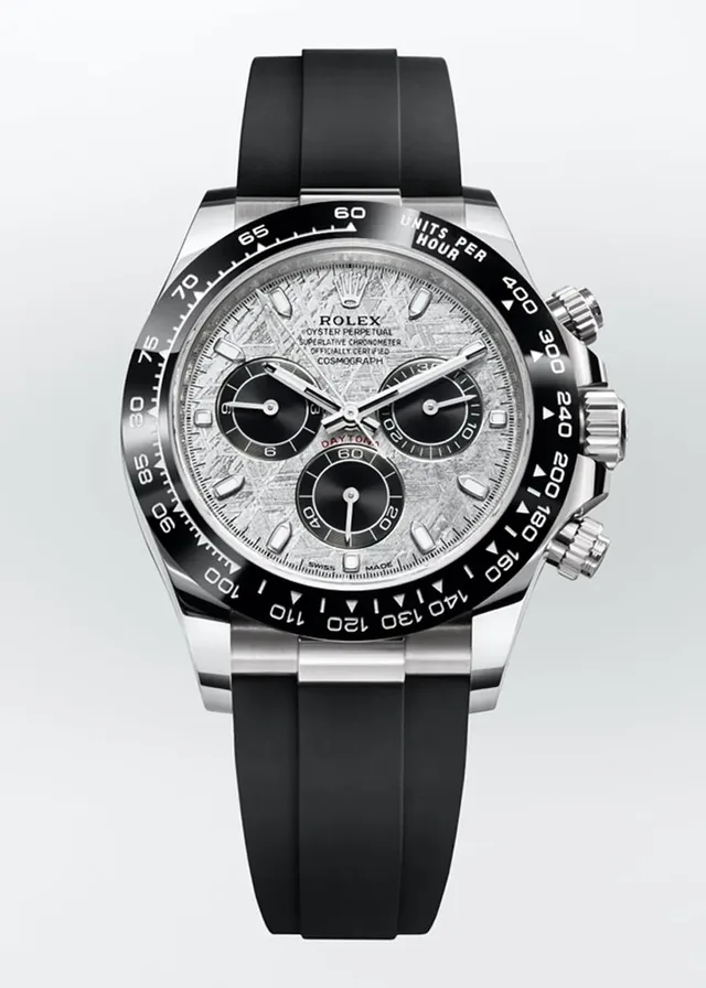 Rolex stellte 2021 die Oyster Perpetual Cosmograph Daytona mit einem Meteorit-Zifferblatt in Weißgold-, Gelbgold und Everose-Gold vor. Für die Zifferblätter nutzt Rolex dünne Scheiben des Metallmeteoriten, die Totalisatoren heben sich in allen drei Varianten in Schwarz ab. Die Indexe sind ebenso wie die Zeiger nachtleuchtend und passend zum Gehäusematerial in Edelmetall eingefasst. Unter dem Zifferblatt arbeitet, bis zehn Bar vor eindringendem Wasser geschützt, das hauseigene Kaliber 4130 mit Automatikaufzug. Dieses verfügt über ein Schaltrad sowie eine vertikale Kupplung und bietet eine Gangreserve von 72 Stunden.Iga SwiatekSieh dir diesen Beitrag auf Instagram an