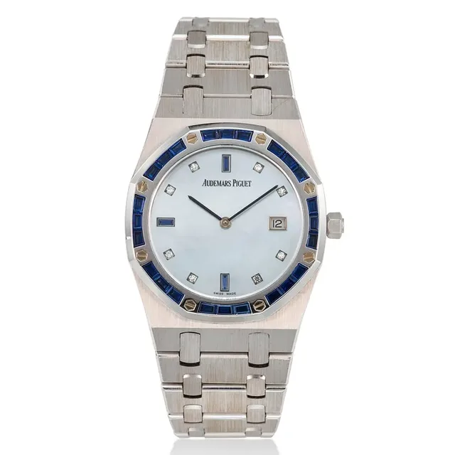Audemars Piguet Royal Oak, 18K Weißgold, mit Saphiren besetzte Quarz-Armbanduhr mit blauem Perlmutt-Zifferblatt und Datum, Gehäuse Nr. D40651, Nr. 107, ca. 1990er Jahre, Zifferblatt: Perlmutt, Diamant und Saphirbesatz, Gehäusedurchmesser: 33 mm, Schätzwert: €9,100-14,000