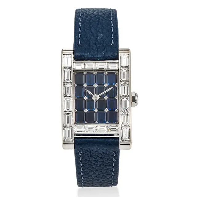 Cartier Tank, Unikat, 18K Weissgold, Baguette Diamantbessatz rund um das Gehäuse, Baguette-Saphir-Zifferblatt, Gehäusenummer, 646'570, ca. 2000s, Uhrwerk: Handaufzug, Zifferblatt: Blaue Baguette-Saphire, Gehäuse: 23 mm, Schätzwert: €19.000-27.000