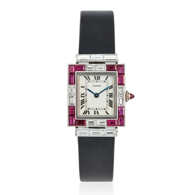 Cartier Tank Uhr, Einzelstück, Platinum, Diamant und Ruby Baguette Set, Clasp No.