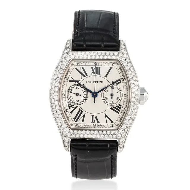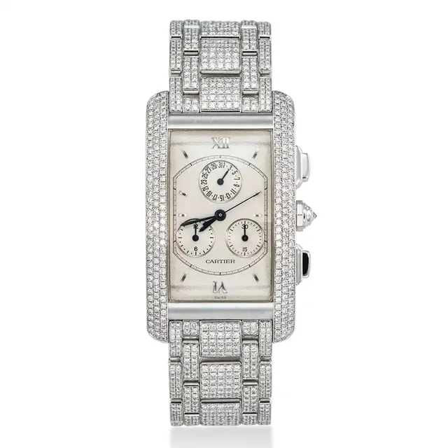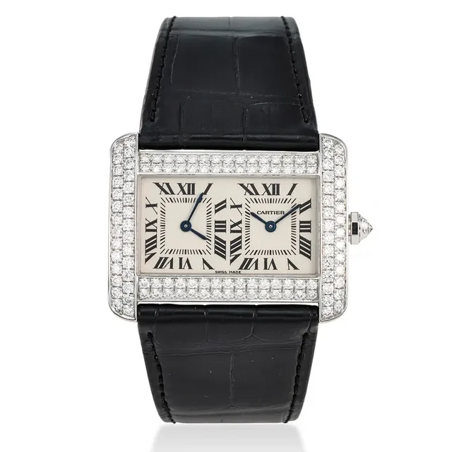 Cartier, Ref. 2756, Tank Divan, seltene Dualzeit-Uhr aus 18K Weißgold mit Diamantbesatz, ca. 2000s, Gehäuse-Durchmesser: 38.5 x 30 mm, Gehäuse Nr': 936404Ce, Zifferblatt: Weiß, Uhrwerk: Quarz, Schätzwert: €11,000-16,000