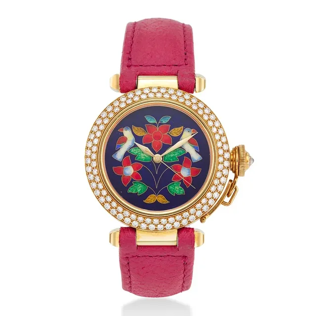 Cartier, Ref. 2495, Pasha, limitierte Edition aus 18K Weißgold mit Diamanten, Cloisonné-Zifferblatt, ca. 2000s, Gehäuse-Durchmesser: 36 mm, Gehäuse Nr': 9/20, Zifferblatt: Cloisonné, Uhrwerk: Automatik, Schätzwert: €14,000-23,000