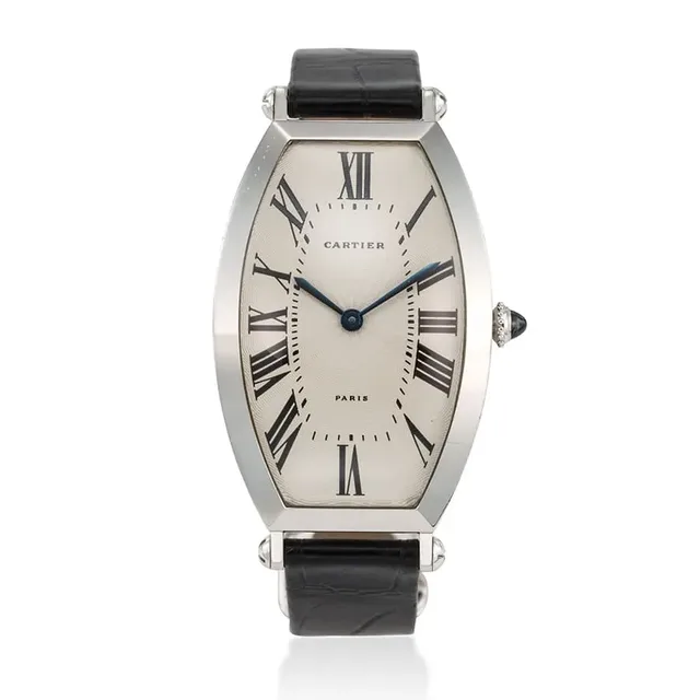 Cartier, Paris Tonneau, Platin-Armbanduhr in Tonneau-Form, ca. 1990s, Gehäuse-Durchmesser: 26 mm x 46 mm, Gehäuse Nr': A111045, Zifferblatt: Weiß guillochiert, Uhrwerk: Handaufzug, Schätzwert: €11,000-16,000