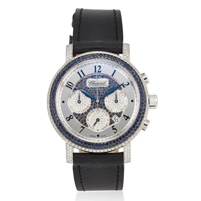 Chopard, Ref. 17/1868-23, Mille Miglia „Elton John", eine limitierte Auflage aus 18K Weißgold, mit Diamanten und Saphiren besetzt, Chronograph mit Datumsanzeige, ca. 1990, Gehäuse-Material: 18K Weißgold, Diamant- und Saphirbesatz, Gehäuse-Durchmesser: 38.5 mm, Gehäuse Nr': 948148, Nr. 4/50, Zifferblatt: verspiegelt, mit Diamanten und Saphiren besetzt, Uhrwerk: Quarz, Schätzwert: €7,300-11,000
