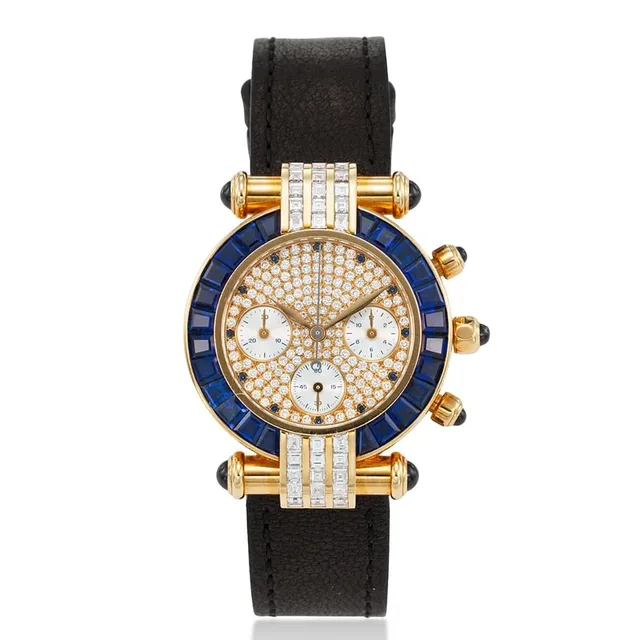 Chopard, Ref. 38/3180-23, Imperiale, 18K Gold, mit Baguette-Saphiren und Diamanten besetzt, Chronograph, ca. 2000s, Gehäuse-Durchmesser: 32 mm, Gehäuse Nr': 391565, 4143, Zifferblatt: Pave, Diamant- und Saphirbesatz, Uhrwerk: Quarz, Schätzwert: €7,300-11,000