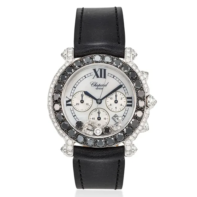 Chopard, Ref. 28/3307-50, Happy Sport, 18K Weißgold, Diamanten und schwarze Diamanten, Chronograph mit Perlmutt-Zifferblatt, Datum und 'EJ‘-Anhängern, ca. 2000s, Gehäuse-Durchmesser: 38.5 mm, Gehäuse Nr': 676780, 1227, Zifferblatt: Perlmutt, Diamant, schwarzer Diamant, Uhrwerk: Quarz, Schätzwert: €5,500-9,100
