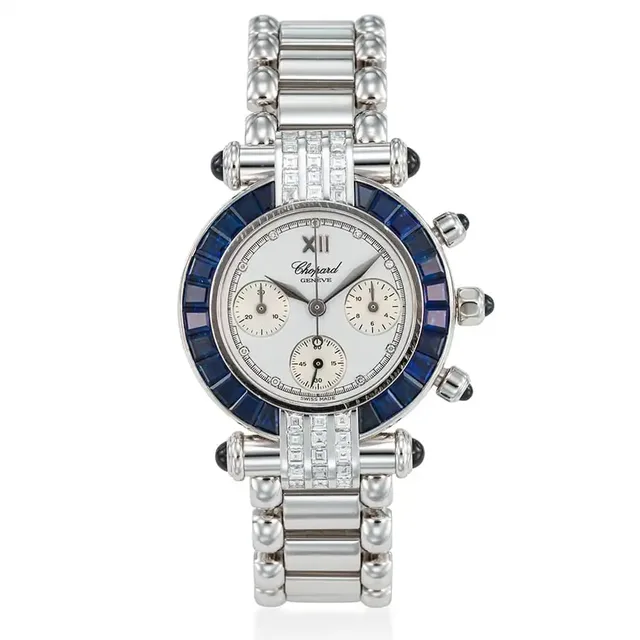 Chopard, Ref. 38/3180-23, Imperiale, 18K Weißgold, mit Baguette-Saphiren und Diamanten besetzt, Chronograph, ca. 2000s, Gehäuse-Durchmesser: 32 mm, Gehäuse Nr.: 391581, 4143, Nr. 186, Zifferblatt: Weiß, diamantbesetzt, Uhrwerk: Quarz, Schätzwert: €9,100-16,000