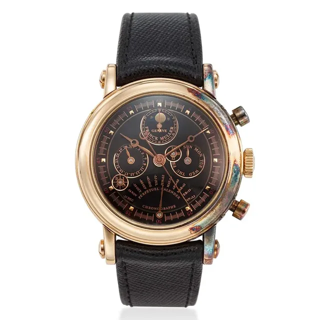 Franck Muller, Ref. 7000 Qp E, seltene Automatikuhr mit Ewigem Kalender und Mondphase, retrogradem Monat, Schaltjahr und 24 Stunden-Anzeige, 18K Rotgold, ca. 1990er Jahre, Gehäuse-Durchmesser: 39 mm, Gehäuse Nr': 20, Zifferblatt: Schwarz, Uhrwerk: Automatik, Schätzwert: €9,100-14,000