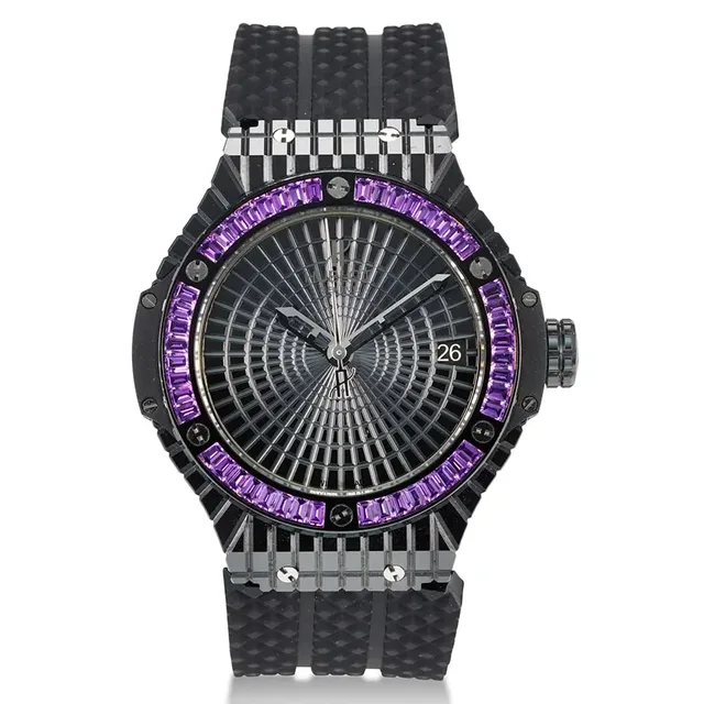 Hublot, Ref. 346.Cd.1800.Lr.1905, Big Bang "Tutti Frutti" Kaviar, Automatikuhr aus Keramik und DLC-beschichtetes Titan, gefasst mit Amethysten, Datumsanzeige, ca. 2010s, Gehäuse-Durchmesser: 41 mm, Gehäuse Nr': 945920, Zifferblatt: Keramik, Uhrwerk: Automatik, Schätzwert: €7,300-11,000