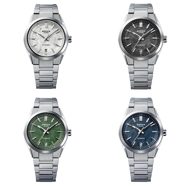 Ein Feld, das bislang fest in der Hand von Marken wie Seiko und Citizen lag. Und Casio geht diesen Schritt klug: Die EFK-100 kombiniert ein automatisches Uhrwerk mit sportlich-eleganter Formsprache und hochwertigen Materialien – zu einem Einstiegspreis, der fast zu gut klingt, um wahr zu sein. Die Serie umfasst fünf Varianten: vier aus Edelstahl (alle unter 300 Euro) sowie ein Modell, das mit einem Gehäuse und Zifferblatt aus geschmiedetem Carbon besonders hervorsticht – jenem leichten, extrem festen Werkstoff, der seinen Ursprung in der Luft- und Raumfahrt hat und mittlerweile vor allem in Supersportwagen zuhause ist.