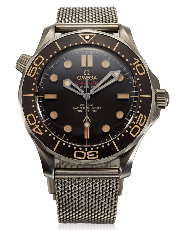OmegaZur Feier der 25-jährigen Zusammenarbeit zwischen Omega und James Bond wurde 2020 die „Seamaster Diver 300M 007 Edition“ präsentiert. Craig selbst trägt den militärisch angehauchten Zeitmesser aus Titan, der auffallend leicht und robust zugleich ist, in seinem letzten Auftritt als Bond im 2020 veröffentlichten Film „No Time to Die“. Die 42 Millimeter große Sonderedition besitzt eine Lünetteneinlage und ein Zifferblatt aus braunem Aluminium – zusammen mit der beigefarbenen Leuchtmasse sowie dem gewölbten Saphirglas entsteht so eine aufregende Vintage-Ästhetik, die durch das Milanaise-Band, das ebenfalls aus Titan besteht, komplettiert wird.