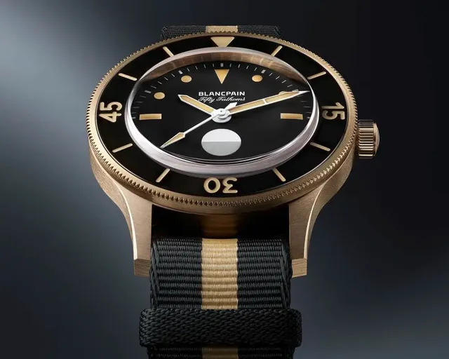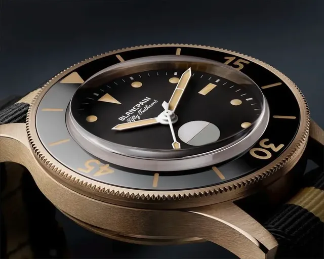 Interessant ist das Gehäuse: Während die historische MIL-SPEC aus Neusilber gefertigt war, nutzt Blancpain für die Act 3 Bronzegold. Diese Legierung kannte man bisher nur von Omega. Sie besteht aus 50 Prozent Kupfer, 37,5 Prozent Gold, etwas über 5 Prozent Silber und jeweils unter 5 Prozent Palladium und Gallium. Damit handelt es sich streng genommen nicht um Gold (es sind nur 9 Karat), sondern um eine besonders feine Bronze: Im Gegensatz zu anderen Bronzelegierungen lässt sie sich direkt auf der Haut tragen, ist sehr korrosionsbeständig und setzt nur langsam Patina an. Das Gehäuse ist mit 41,3 mm Durchmesser ähnlich groß wie das historische Vorbild und bis 300 m wasserdicht – die ersten Fifty Fathoms waren bis etwa 100 m wasserdicht gewesen (Fifty Fathoms bedeutet "50 Faden, was einer Tiefe von 91,45 m entspricht). Das zweifarbige NATO-Armband besteht aus recycelten Fischernetzen, die im Meer gesammelt wurden, und passt farblich zur Uhr.