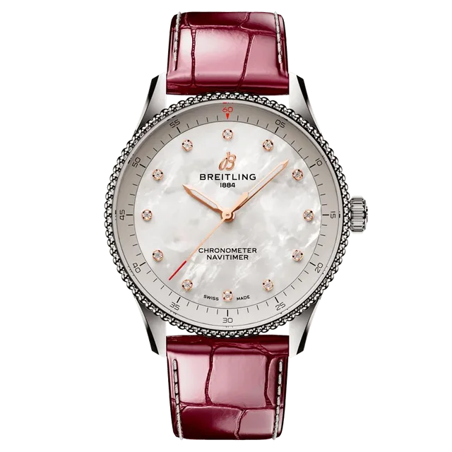 Breitling Navitimer 32 | Referenz A77320E61A2P2 | Breitling 77 Quarzwerk | Edelstahl-Gehäuse| Durchmesser 32 mm | Armbandmaterial Alligatorleder | Armbandfarbe Burgunder | 4.100 Euro