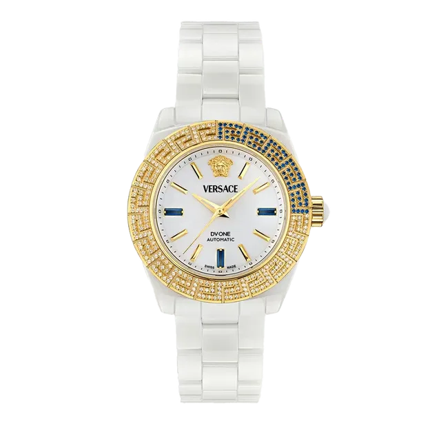 Versace DV One Automatikuhr | Referenz PVE6B005-P0023 | Gehäuse Weiße Keramik/Greca Oberring besetzt mit 206 Diamanten (0,49 kt) und 74 Saphiren (0,14 kt) | Zifferblatt: Weißes Emaille-Zifferblatt mit Versace-Logo und Medusa bei 12 Uhr/DV One Aufschrift bei 6 Uhr/2 Saphire bei 6 und 9 Uhr | Armband: Weißes Keramikband | Uhrwerk Ronda R150.2 | 8.000 Euro