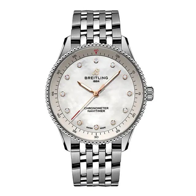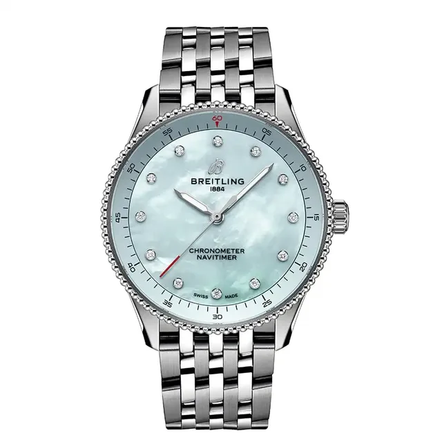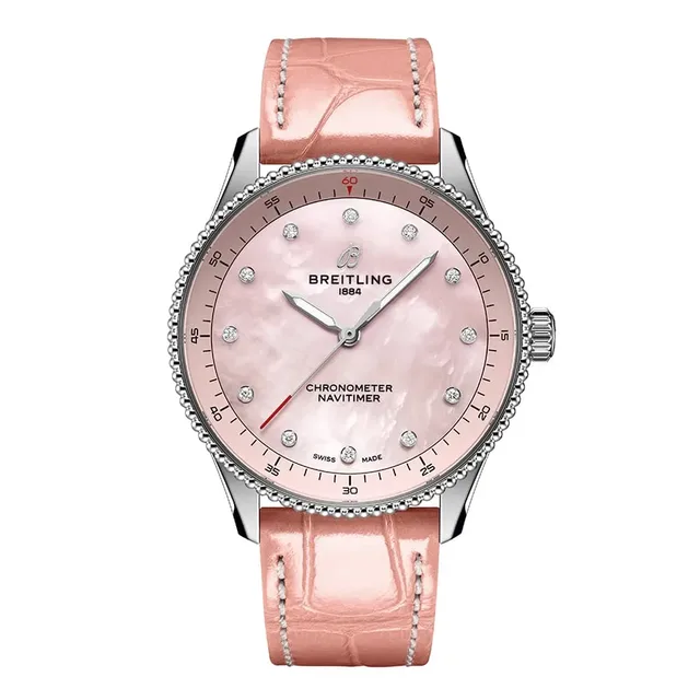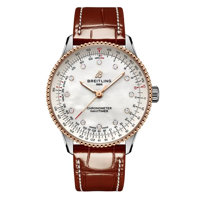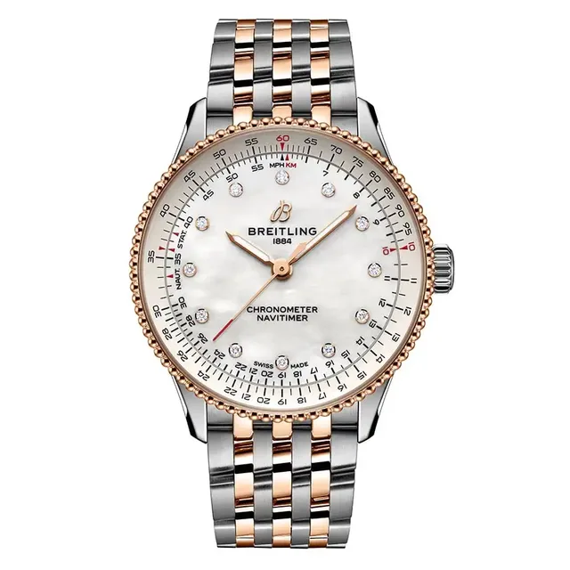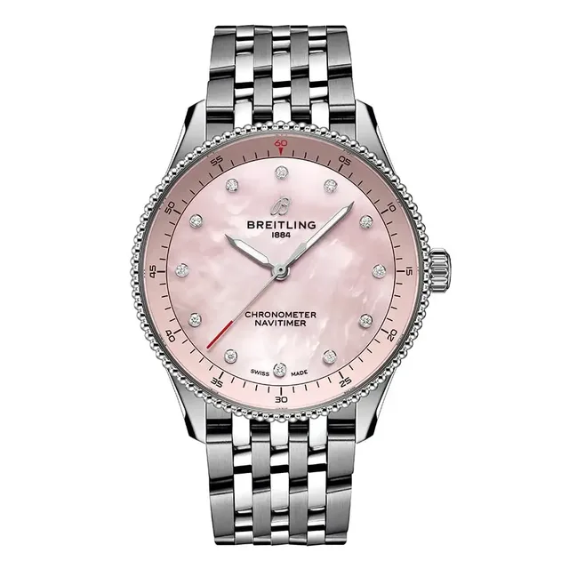 Die Edelstahlreferenzen (A17327361L1A1, A17327361L1P1, A17327211G1A1, A17327211G1P1, A17327381B1A1 oder A17327381B1P1) mit Metallic-Zifferblättern kosten 4.900 Euro, die Varianten aus Edelstahl und 18-karätigem Rotgold (U17327211A1U1 oder U17327211A1P1) sind für 9.400 Euro erhältlich. Für die beiden Varianten aus 18-karätigem Rotgold (R17327211A1R1 oder R17327211A1P1) müssen Sie mit 32.000 Euro rechnen.Die Navitimer 32, eine Neuinterpretation der klassischen Fliegeruhr, verzichtet auf den Rechenschieber und setzt auf ein schlichteres Zifferblattdesign, das zum schlanken 32 mm Gehäuse passt. Sie besticht durch ihre Perlmuttzifferblätter in zarten Farben wie Rosa, Weiß und Hellblau. Auch bei dieser Größe sind Labordiamanten in allen Varianten verarbeitet, ebenso wie das rückverfolgbare Gold in der Vollrotgoldvariante und der 18-karätigen Rotgoldlünette des zweifarbigen Modells. Diese Uhren sind sogar bis zu 5 bar wasserdicht. Angetrieben werden die kleinen Modelle von einem Quarzwerk, das COSC-zertifiziert ist.
