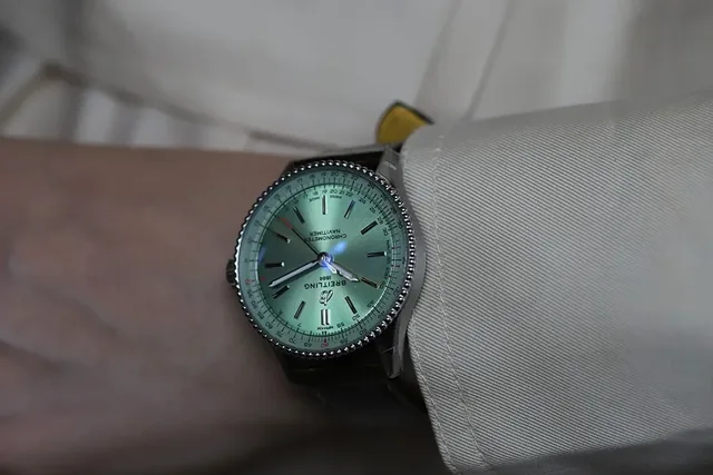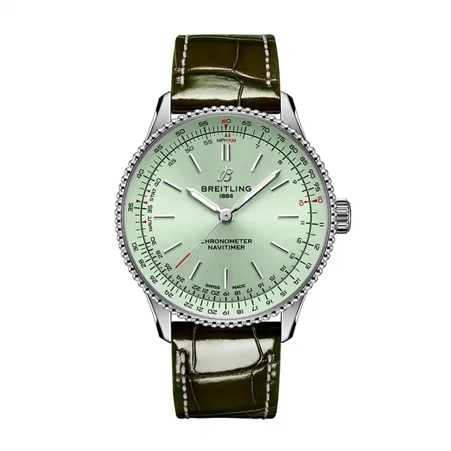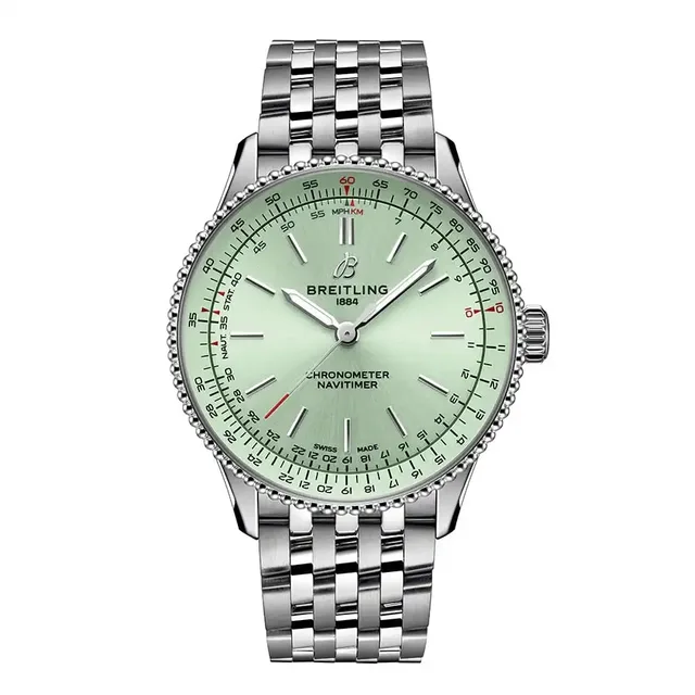 Die Navitimer Automatic 36, mit ihrem 36 mm Gehäuse, behält die charakteristische Perlenlünette und den unverkennbaren kreisförmigen Rechenschieber bei. Sie ist jetzt in drei eleganten Metallic-Zifferblattfarben (Mintgrün, Silber und Anthrazit) mit Stabindexen sowie einem Perlmuttzifferblatt mit Labordiamanten erhältlich. Diese gezüchteten Diamanten sind von akkreditierten Produzenten rückverfolgbar, die den SCS-007 Nachhaltigkeitsstandard für Diamanten erfüllen. Ebenso werden die Vollgoldvariante und die Goldlünette des zweifarbigen Modells aus laut Breitling "besserem Gold" gefertigt, das aus handwerklichen und umweltfreundlichen Bergbaubetrieben stammt. Das bombierte Saphirglas ist beidseitig entspiegelt.Die Navitimer 36 wird vom automatischen COSC-zertifizierten Breitling-Kaliber 17 angetrieben, das mit einer Unruhfrequenz von 28 800 a/h bzw. 4 Hz schwingt. Die Gangreserve beläuft sich auf ca. 38 Stunden. Die Uhren sind bis 3 bar wasserdicht.