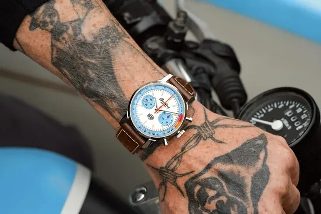 Die zweite Sonderedition von Breitling und der australischen Motorrad- und Lifestyle-Marke Deus Ex Machina kommt ebenfalls bunt, aber mit veränderter Farbgebung daher: Bei der neuen Top Time Deus Limited Edition drehen sich stahlfarbene Stunden- und Minutenzeiger sowie ein orangefarbener Stoppsekundenzeiger über einem weißen Zifferblatt mit Totalisatoren und Rehaut in Hellblau. Auf der schwarzen Tachymeterskala am Zifferblattrand hebt sich das Motto der Marke „In Benzin Veritas“ ab, und auf dem Gehäuseboden befindet sich die Abbildung eines Retro-Motorradfahrers.