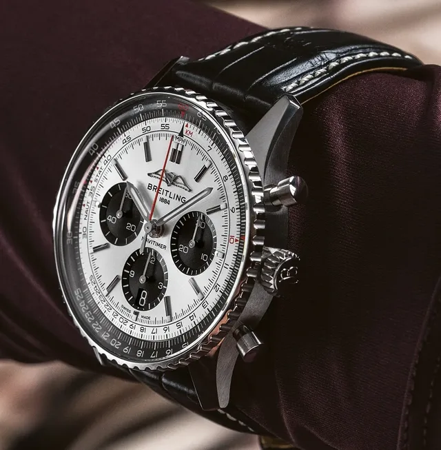 Anblick: Am Handgelenk ist auch die neue Navitimer über die signifikante Rechenschieberlünette sofort erkennbar.