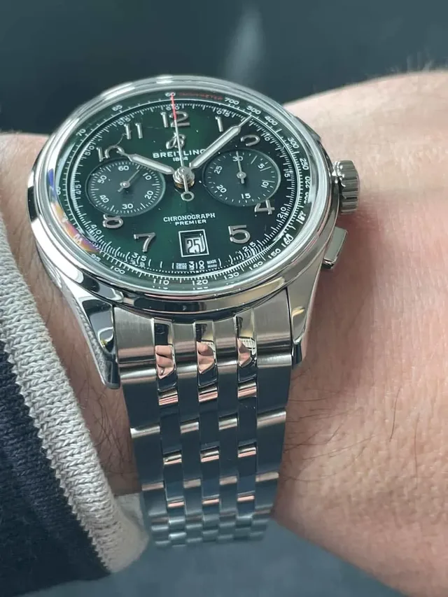 Es gibt die Uhr für 8.950 Euro mit siebenreihigem Stahlband, das das Modell etwas moderner wirken lässt, oder für 8.600 Euro am Krokolederband, das den Retrolook unterstützt. Neben dem grünen Zifferblatt sind noch fünf weitere Versionen erhältlich: mit Zifferblättern in den Farben Lachs, Blau, Schwarz und Creme sowie eine Rotgoldausführung, ebenfalls mit einem cremefarbenen Zifferblatt.Breitling hat mit der Premier B01 also ein besonders schönes Modell aus der eigenen Historie neu aufgelegt und dabei sogar seine beiden Kerneigenschaften Eleganz und Funktionalität verbessert. Mit vielen raffinierten Designdetails und dem leistungsstarken Manufakturkaliber steht bei der Neuheit einem ähnlichen Erfolg wie vor 80 Jahren nichts im Weg. jk
