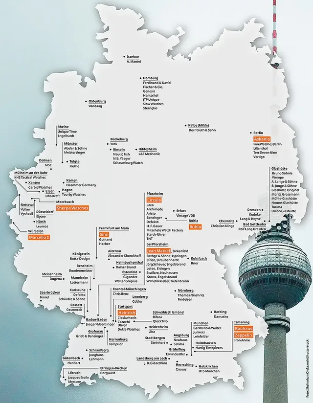 Aktuell zählen wir in Deutschland über 80 Uhrenhersteller – eine respektable Zahl, die Deutschland durchaus als wichtiges Uhrenland etabliert. Die deutschen Hersteller besetzen zahlreiche Gebiete der Uhrmacherei und schöpfen dabei aus jahrhundertealter Erfahrung ebenso wie aus moderner Ingenieurskunst, für die Deutschland Weltruhm genießt. Glashütte ist dabei das Zentrum der deutschen Uhrmacherkunst, aber auch in vielen anderen Regionen des Landes werden hochwertige Zeitmesser gefertigt. Wo genau, das sehen Sie in unserer Deutschlandkarte.