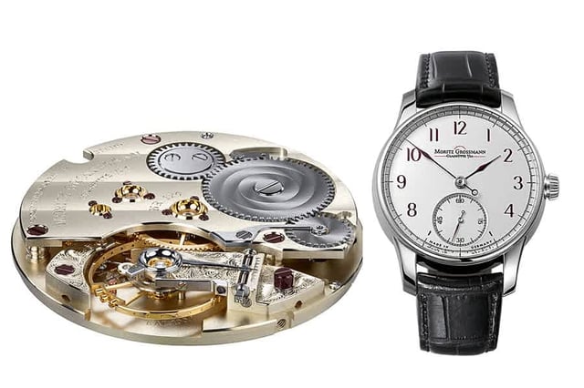 Moritz Grossmann: Manufakturkaliber 100.2 in der Benu: Zweidrittelplatine, gestufter und gravierter Unruhkloben, dreibahniger Sonnenschliff