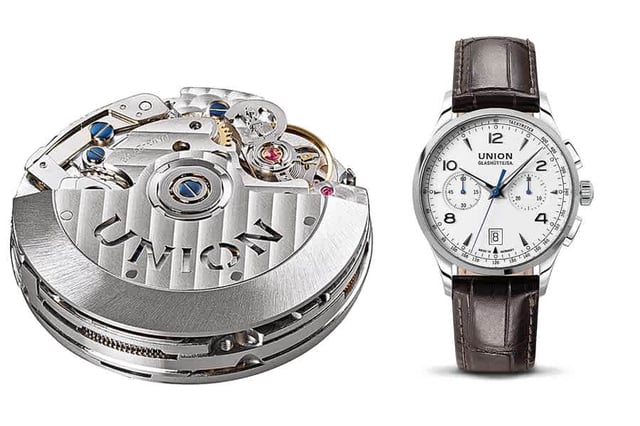 Union Glashütte: Kaliber UNG-27.02 auf Basis des Valjoux 7753 im Noramis Chronographen. Um der Glashütte-Regel zu entsprechen, wird das Uhrwerk vor Ort modifiziert, veredelt und aus Einzelteilen zusammengebaut