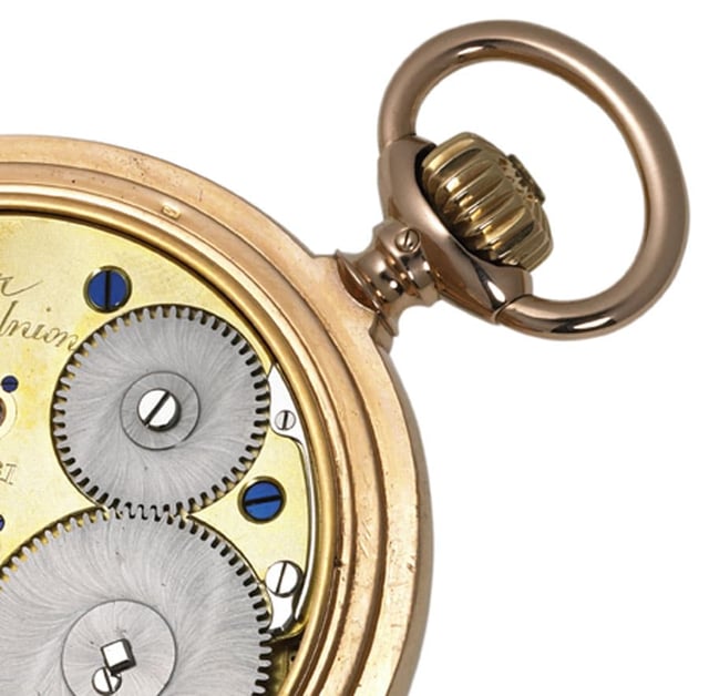 Dieses Werk einer Union-Taschenuhr aus dem Jahr 1908 besitzt ein Glashütter Gesperr mit der typischen geschwungenen Sperrfeder