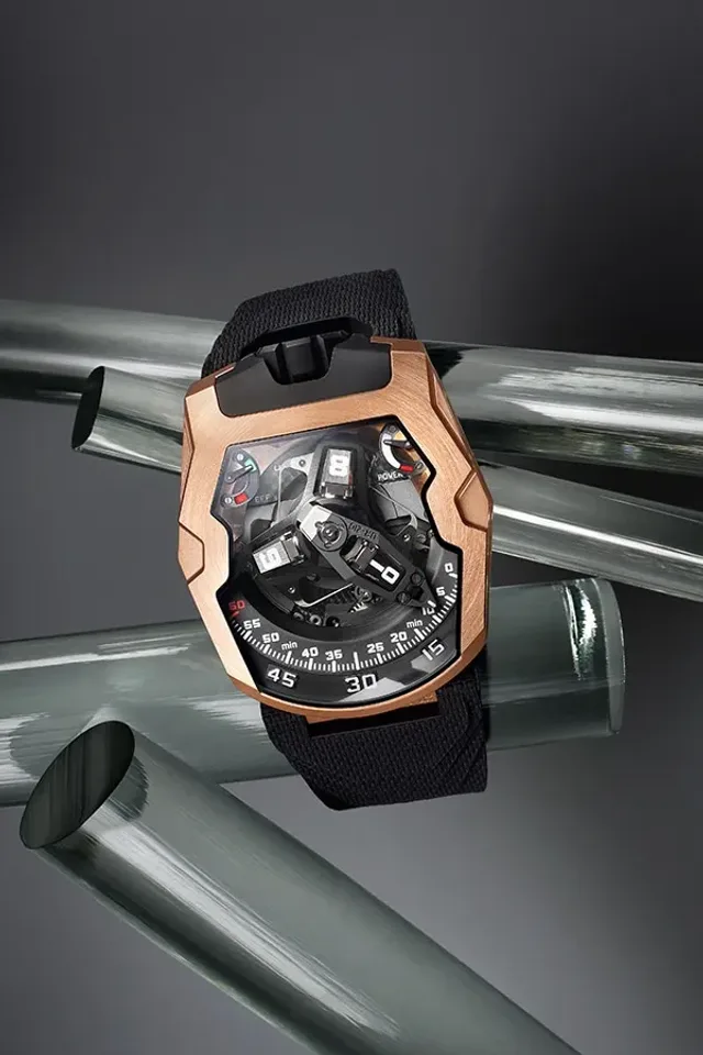 Ein weiterer Vertreter der uhrmacherischen Avantgarde ist die Genfer Manufaktur Urwerk, die so außergewöhnliche mechanische Kreationen wie die UR-210 RG mit Satellitenanzeigen an drei wechselnden Armen hervorbringt.