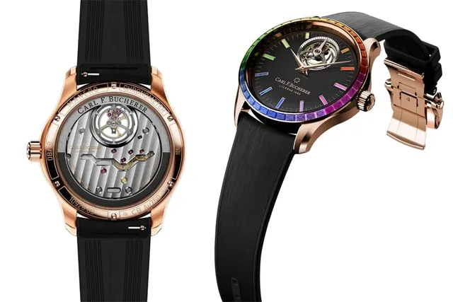 Das 135-jährige Bestehen feiert Carl F. Bucherer mit einer neuen Iteration der Manero Tourbillon Double Peripheral. In Regenbogen-Optik hebt das Modell die Manero-Linie sowohl in Sachen Handwerkskunst als auch Technologie auf die nächste Stufe.Als "Double Peripheral" verfügt das Uhrwerk mit 33 Steinen über zwei der von Carl F. Bucherer patentierten peripheren Bauelemente: einen Automatikaufzug und einen «schwebenden» Tourbillonkäfig. Dazu veredelt Carl F. Bucherer das Modell mit Edelsteinen.