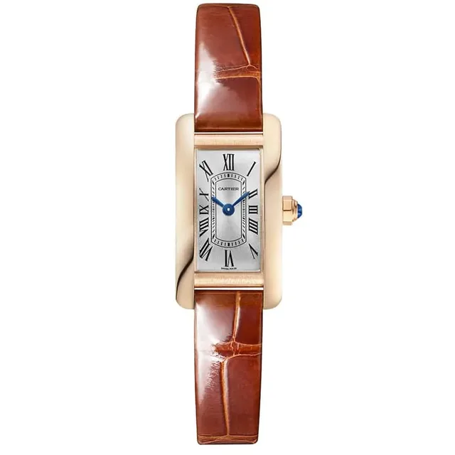 Tank Américaine Mini | Quarzwerk | Gehäuse aus 750er Roségold | Mehrkantaufzugskrone, besetzt mit einem facettierten Saphir | Versilbertes Zifferblatt mit Sonnenschliff, schwertförmige Zeiger aus gebläutem Stahl, Saphirglas | Armband aus glänzendem dunkelbraunem Alligatorleder, Stiftschließe aus 750er Roségold | Gehäuseabmessungen: 28,0 mm x 15,2 mm, Höhe: 6,5 mm | Wasserdicht bis zu 3 bar | Referenz WGTA0132 | 8.300 Euro