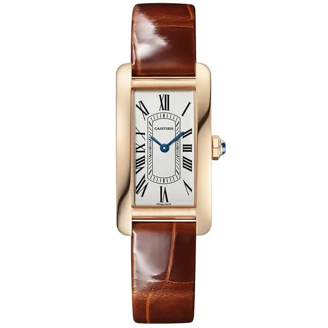 Tank Américaine, kleines Modell | Quarzwerk | Gehäuse aus 750er Roségold, Mehrkantaufzugskrone mit einem Saphir besetzt | Satiniertes silberfarbenes Zifferblatt, schwertförmige Zeiger aus gebläutem Edelstahl, Saphirglas | Armband aus glänzendem dunkelbraunem Alligatorleder, Stiftschließe aus 750er Roségold | Gehäuseabmessungen: 35,4 mm x 19,4 mm. Höhe: 6,8 mm | Wasserdicht bis zu 3 bar | Referenz WGTA0133 | 12.400 Euro
