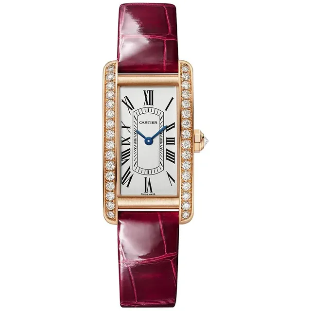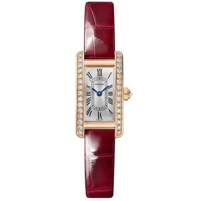 Tank Américaine Mini | Quarzwerk | Gehäuse und Mehrkantaufzugskrone aus 750er Roségold, besetzt mit 31 Diamanten im Brillantschliff von insgesamt 0,55 Karat | Versilbertes Zifferblatt mit Sonnenschliff, schwertförmige Zeiger aus gebläutem Stahl, Saphirglas | Armband aus glänzendem rotem Alligatorleder, Stiftschließe aus 750er Roségold | Gehäuseabmessungen: 28,0 mm x 15,2 mm. Höhe: 6,5 mm | Wasserdicht bis zu 3 bar | Referenz WJTA0041 | 16.100 Euro