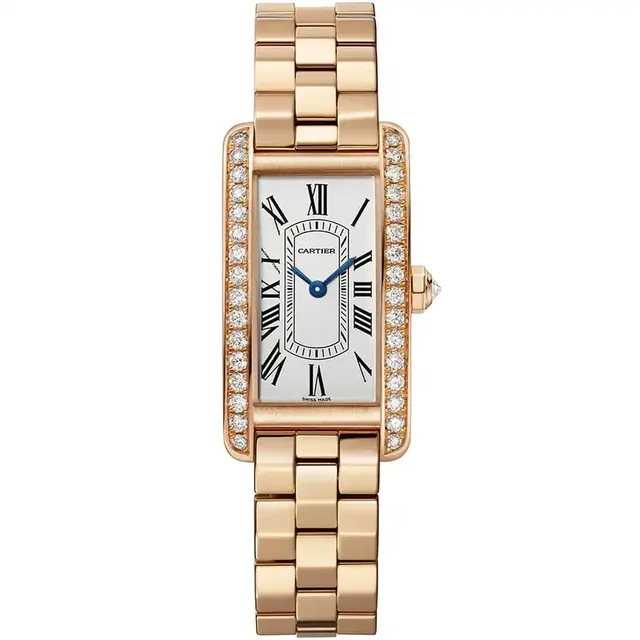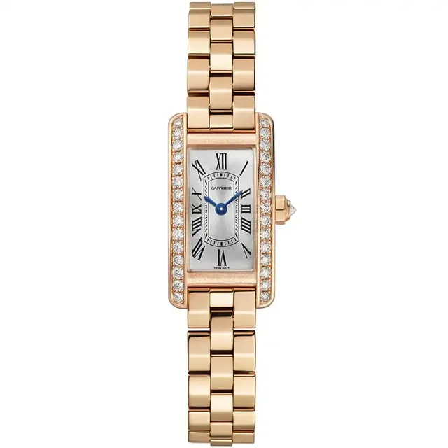 Tank Américaine Mini | Quarzwerk | Gehäuse und Mehrkantaufzugskrone aus 750er Roségold, besetzt mit 31 Diamanten im Brillantschliff von insgesamt 0,55 Karat | Versilbertes Zifferblatt mit Sonnenschliff, schwertförmige Zeiger aus gebläutem Stahl, Saphirglas | Armband aus 750er Roségold | Dreifachschließe aus 750er Roségold | Gehäuseabmessungen: 28,0 mm x 15,2 mm. Höhe: 6,5 mm | Wasserdicht bis zu 3 bar | Referenz WJTA0043 | 28.700 Euro