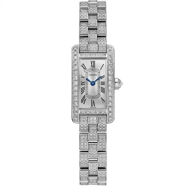 Tank Américaine Mini | Quarzwerk | Gehäuse und Mehrkantaufzugskrone aus 750er Weißgold, besetzt mit 41 Diamanten im Brillantschliff von insgesamt 0,69 Karat | Versilbertes Zifferblatt mit Sonnenschliff, schwertförmige Zeiger aus gebläutem Stahl, Saphirglas | Armband aus 750er Weißgold, besetzt mit 528 Diamanten im Brillantschliff von insgesamt 2,60 Karat, Stiftschließe aus 750er Roségold | Gehäuseabmessungen: 28,0 mm x 15,2 mm. Höhe: 6,5 mm | Wasserdicht bis zu 3 bar | Referenz WJTA0045 | 57.500 Euro